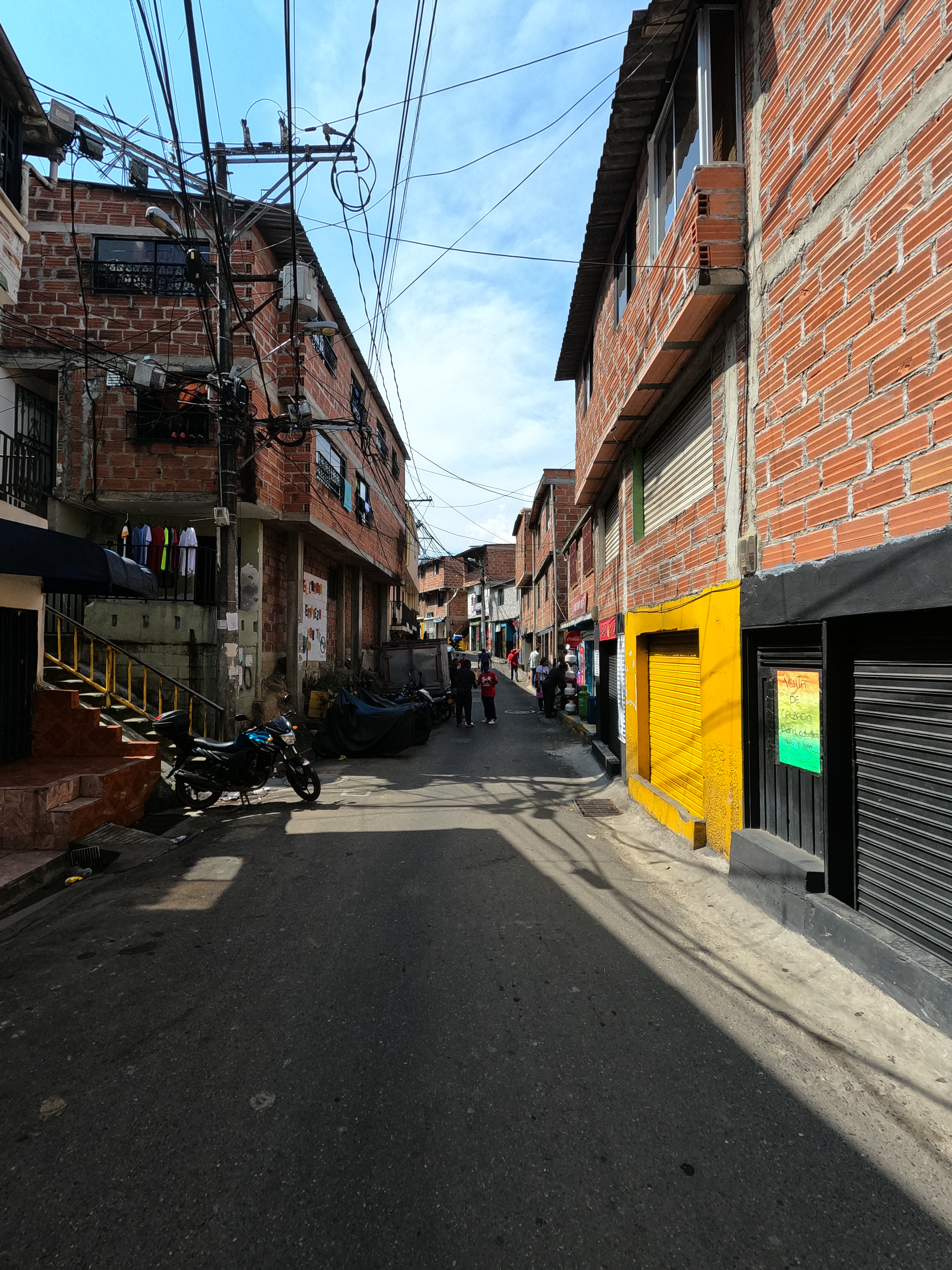 Las casas, como en la mayoría de Medellín, son con ladrillos, así que no hay mucho color. Bueno, sí, porque están llenas de graffitis con escaleras y callejones estrechos. De una casa a la del frente, no hay más de dos o tres metros. Nos dijeron que era peligroso y la verdad, nosotros no lo vimos así. Estuvimos un buen rato dando vueltas y metiéndonos por los callejones y no nos pasó nada, de hecho, comimos allá y estuvimos muy bien.