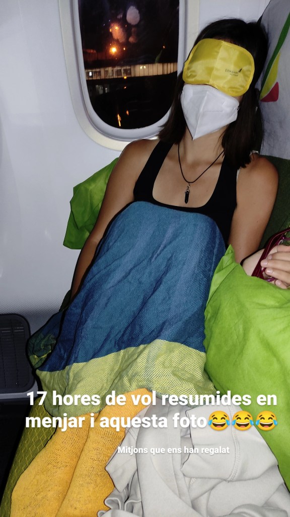 Recomendamos Ethiopian Airlines porque, aunque a simple vista, no nos lo parecieron, los asientos eran muy cómodos, tuvimos espacio para apalancarnos y nos dieron de comer (comidas muy, muy completas con arroz, acompañante y pollo) 3 veces en 11 horas. También nos dieron estos calcetines tan guais, las antiojeras o como se llame y un cepillo de dientes con pasta. ¡Ah, y la manta y los cojines súper calentitos!